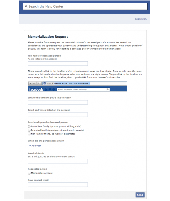 The memorialisation request process (below) requires a ‘proof of death’ link to an obituary or news article about the person’s death. What a truly digital world we now live in.