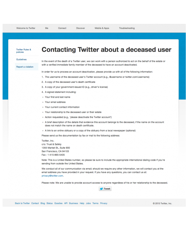 Both Facebook and Twitter have designated spaces explaining the protocol for profile removal or ‘memorialisation’.